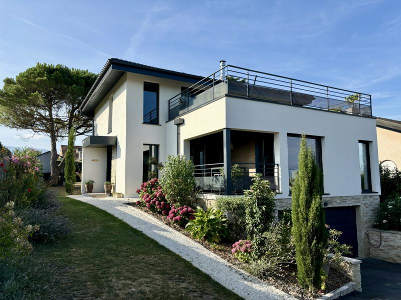 Idéalement située dans un environnement paisible, à deux pas du lac, cette villa récente séduit par son confort, ses beaux volumes, sa modernité et sa luminosité.<br>La vaste pièce de vie traversante, baignée de lumière, s'ouvre sur le jardin exposé plein Sud et offre une agréable vue sur le lac.<br>Le rez-de-chaussée accueille un espace salon chaleureux avec poêle à bois, un coin musique ainsi qu'une suite parentale.<br>À l'étage, vous découvrirez trois grandes chambres, une salle de bains équipée d'une douche et d'une baignoire, ainsi qu'une très grande terrasse bénéficiant d'une superbe vue sur le lac.<br>Le sous-sol dispose d'un grand garage.<br>Le chauffage est assuré par une pompe à chaleur avec plancher chauffant, complétée par une seconde pompe à chaleur permettant le rafraîchissement en été.<br>Le terrain, entièrement clôturé et soigneusement aménagé, est piscinable et sécurisé par un portail électrique.<br>